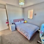 A cosy and inviting bedroom currently set up for a child, featuring light décor and soft carpeting for a comfortable feel. The wide window allows for plenty of natural light, while the layout easily accommodates a single or small double bed, dresser, and wardrobe. A charming and adaptable space that could also serve as a guest room or home office.