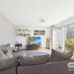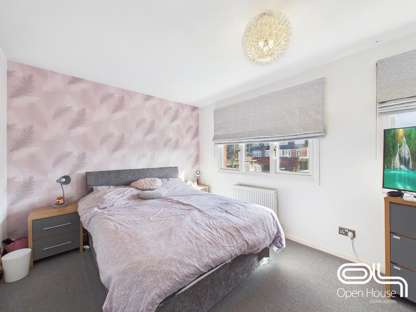 The master bedroom is a restful sanctuary with a soft, neutral carpet and double windows that allow natural light to fill the room. A tasteful pink feature wall adds a subtle touch of colour, complementing the understated decor. The room is well-sized to accommodate a double bed and bedside tables comfortably, creating a cosy personal retreat.