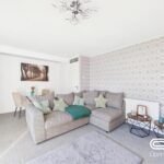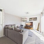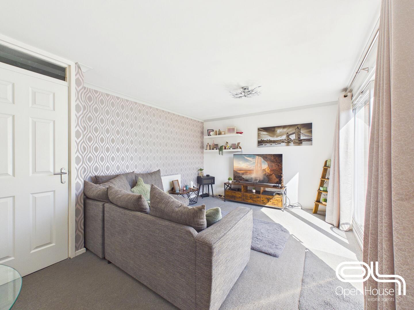 This welcoming living room boasts a bright and airy space, enhanced by a large window and sliding doors that open out to the garden, allowing natural light to flood in. The room is spacious enough to accommodate a comfortable seating area, with a patterned feature wall adding a touch of style and warmth to the space. It offers a lovely view over the garden and easy access, perfect for relaxed family living and entertaining.