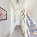 This hallway provides a bright and welcoming entrance to the home, with light carpeting and neutral walls contributing to a fresh feel. It connects the main rooms of the ground floor and leads upstairs, where a fitted cupboard offers useful storage space. The neutral tones make it easy to personalise and add your own style.
