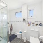 This bathroom is finished in neutral tones with a combination of wall tiling and a darker floor. It features a modern shower enclosure, a bath, a toilet, and a washbasin beneath two frosted windows that provide natural light while maintaining privacy.