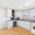 The kitchen provides a practical yet stylish setting, featuring white cabinetry that extends around the room and contrasts with the darker worktops. A window above the sink overlooks the front garden, adding brightness and a pleasant view while you work. The layout includes ample storage and space for appliances, creating a well-equipped environment for daily cooking.