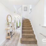 A welcoming hallway forms the entrance to the home, featuring neutral décor and light carpeting that continues up the stairs, creating a bright and airy feel. It provides access to a convenient cloakroom WC, a versatile office or bedroom space, and the garage, making it a practical and functional area.