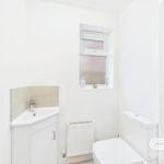 The cloakroom WC off the hallway is conveniently positioned and features a compact basin and WC in a clean, modern style with light walls, providing essential functionality for guests and family alike.