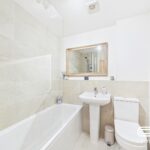 The first floor bathroom is contemporary and well-appointed with a bath and overhead shower, complemented by neutral tiling and a large mirror above the basin. It offers a functional and fresh space for family use.