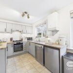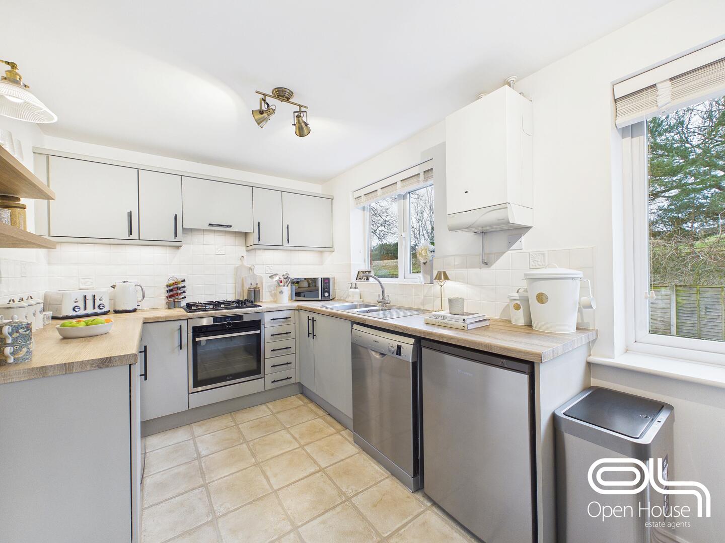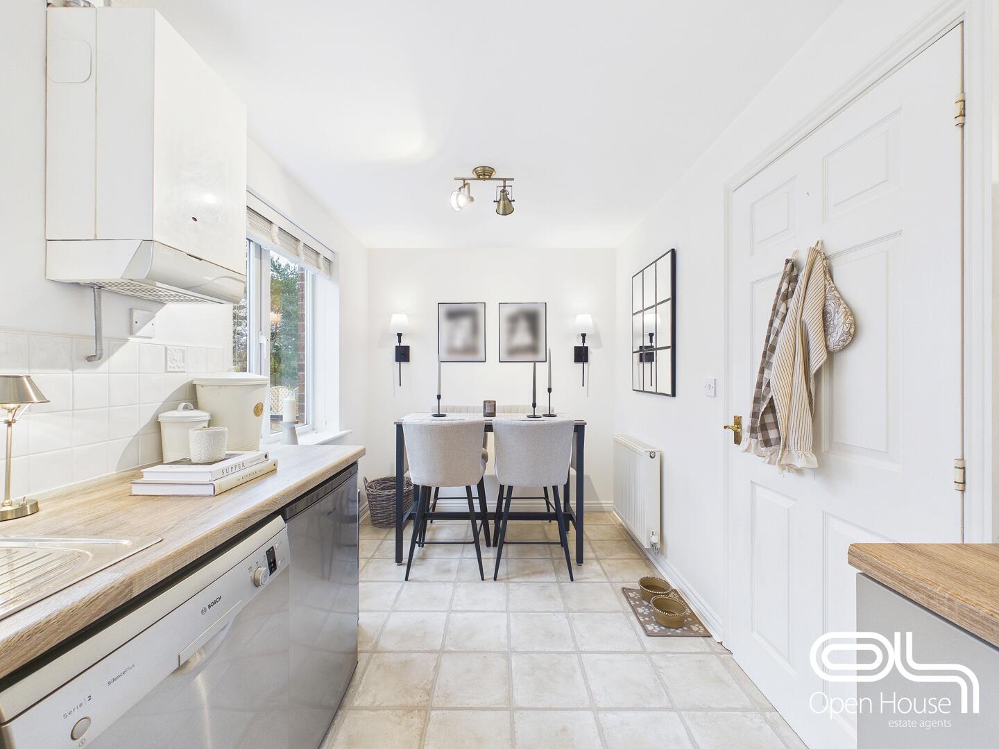 The kitchen diner on the first floor is bright and practical, fitted with modern cabinetry and wood-effect worktops. Ample natural light pours in through two windows, and the tiled floor extends into the adjoining dining area, providing a cheerful space for cooking and casual dining.