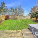 The rear garden is a generous outdoor space with a paved patio area, perfect for entertaining or relaxing outdoors. Beyond the patio, a lawn stretches out bordered by mature shrubs and fencing, offering privacy and a green backdrop for gardening or play.