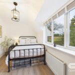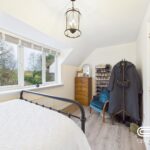 A well-proportioned bedroom on the second floor with a dormer window allows plenty of natural light. The room is finished in calm, neutral tones and includes built-in wardrobes, offering ample storage and a cosy feel.