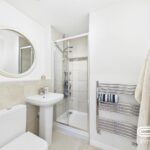 The ensuite shower room is modern and compact, featuring a walk-in shower, basin, and WC. It is finished with light tiling and contemporary fixtures, offering a practical and private bathroom space attached to the principal bedroom.