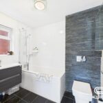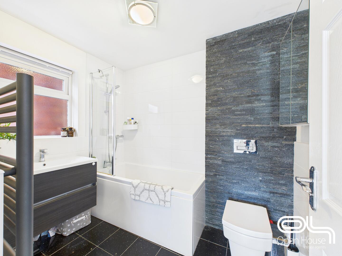 This bright family bathroom is fitted with a white suite that includes a bath with shower above, a wash basin with vanity unit, and a WC. The room is finished with stylish dark flooring and a feature tiled wall, creating a modern and fresh atmosphere.