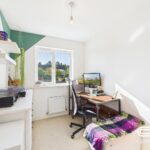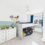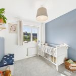 This bedroom is a calming space with neutral decor and a soft, light carpet. It has a peaceful atmosphere and is well-lit by a window overlooking the garden, making it ideal for a child's or guest bedroom.