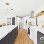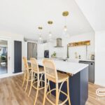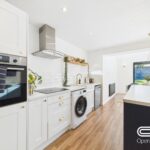 This stunning open plan kitchen, dining, and living area is the heart of the home, thoughtfully designed to combine modern style with everyday functionality. The contemporary kitchen features sleek cabinetry, integrated appliances, and a striking central island with breakfast bar seating—ideal for both casual meals and entertaining.