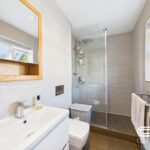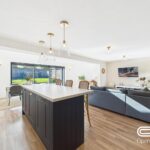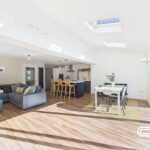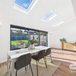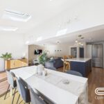 Flooded with natural light from skylights and large sliding doors, the adjoining dining space seamlessly connects to the garden, creating a perfect indoor-outdoor flow. The spacious living area offers a comfortable setting for family relaxation, with ample room for large sofas and a cosy, inviting atmosphere.