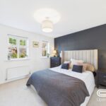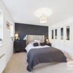 This master bedroom is a generous and restful space, featuring a dark accent wall behind the bed and fitted wardrobes with mirrored doors. It benefits from an en suite shower room providing privacy and convenience.