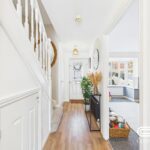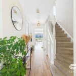 The hallway welcomes you with a bright and airy feel, enhanced by light walls and wood-effect flooring. It includes a staircase with carpeted steps leading to the first floor and provides access to other ground floor rooms, including a cloakroom WC.