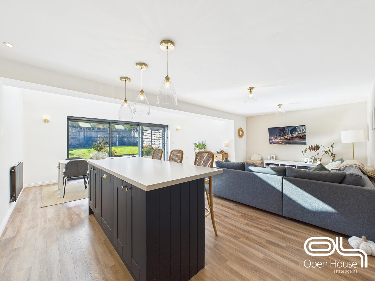 - Stylish open-plan kitchen, dining, and living space with large sliding doors to the garden