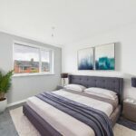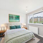 This bedroom offers a calm and neutral space, carpeted in grey and framed by bright white walls. A window overlooks the neighbouring area, providing natural light.