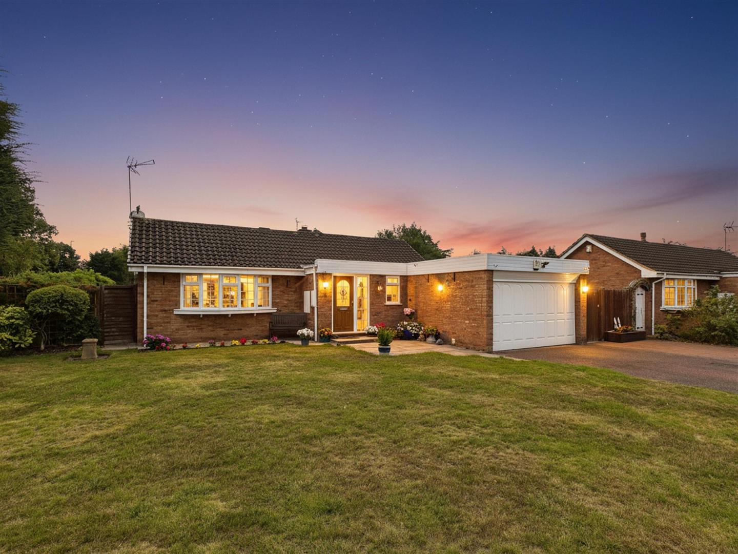 This attractive detached bungalow is set back from the road behind a long, private driveway, bordered with mature hedging and lawn. The front garden is well-maintained, with a spacious lawn area and neat shrubbery, creating a welcoming approach. Integrated double garage to the side adds practical parking and storage options.