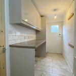Tiled floor, fitted wall units and matching cupboard housing Baxi gas combination boiler. Work surface with tiled splash backs and space and plumbing under for washing machine and dryer, multiple power points, two ceiling lights points, radiator with thermostatic control, door to rear and leading out into rear garden. Door to front leading into porch and door to the front garden.