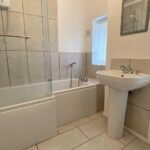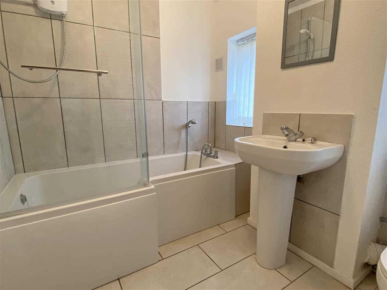 A beautifully finished bathroom with two uPVC double glazed opaque windows to the front, P-shaped panel bath with glass shower screen and wall mounted shower system over with mixer filler and diverter to hand held shower. Pedestal wash hand basin with mixer tap and tiled splash back, close coupled WC, large vertical chrome effect heated towel ladder, tiled floor, ceiling light point.