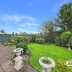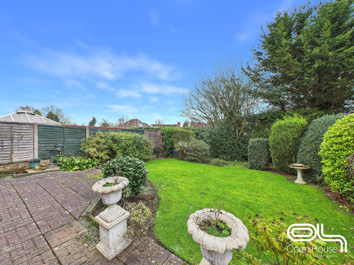 The rear garden is a delightful outdoor space featuring a lawn bordered by mature shrubs and trees for privacy. There is a paved patio area perfect for outdoor seating or dining, creating an inviting spot to relax and enjoy the garden.