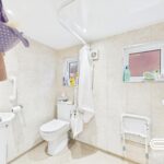 This ground floor bathroom is designed with accessibility in mind, equipped with a walk-in shower and fitted with practical grab rails. Two small windows provide ventilation and natural light, creating a comfortable and functional space.