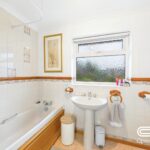 The first floor bathroom is fitted with a full-size bath, a pedestal wash basin, and a WC. The room is tiled halfway up the walls with a decorative border and has a frosted window to ensure privacy while letting in natural light.