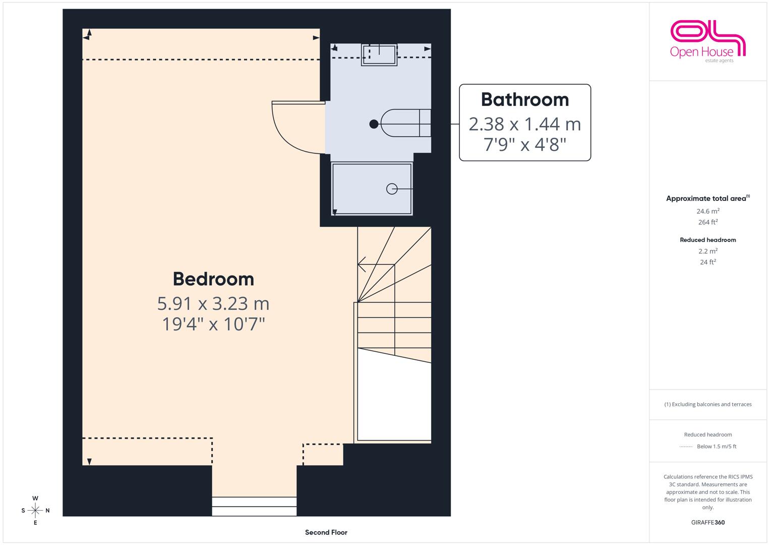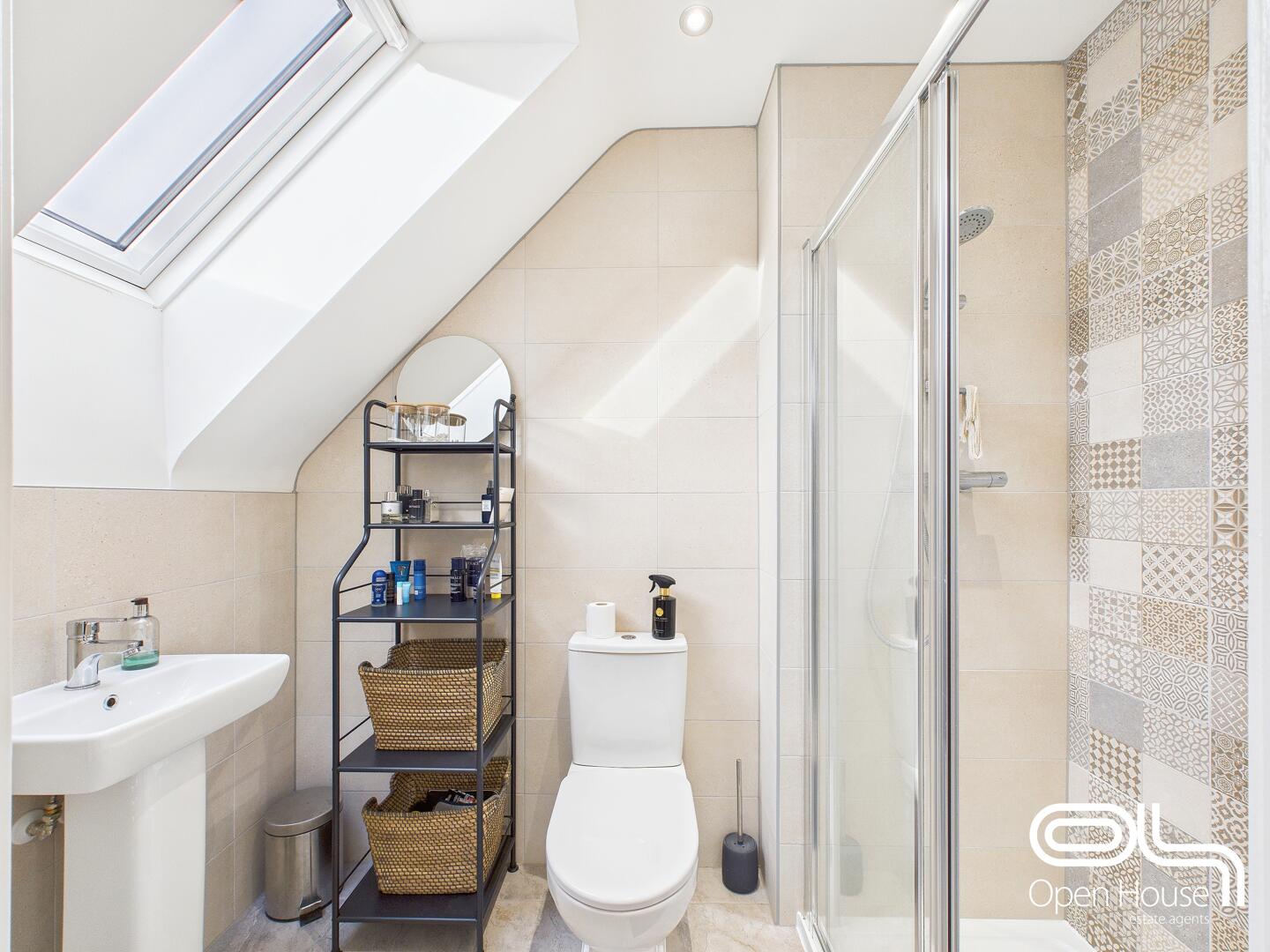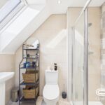 The ensuite bathroom on the second floor offers a modern, bright space with a shower, wash basin, and toilet. A skylight enhances the natural lighting and creates a light, airy feel.