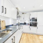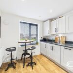 The kitchen offers a sleek and modern space with ample storage in white cabinetry, complemented by dark countertops and integrated appliances. A window allows for plenty of natural light, and there is enough space for a small breakfast table, making it perfect for casual dining or morning coffee.