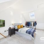 Spanning the entire second floor, this large bedroom is bright and spacious with a calm, neutral decor and a velux window that provides plenty of natural light. It features a private ensuite bathroom, making it a comfortable master suite.