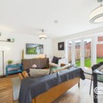 The rear garden is a neat, enclosed outdoor space with a well-maintained lawn bordered by flower beds. It offers a private area for relaxation or outdoor activities, easily accessible from the living room.