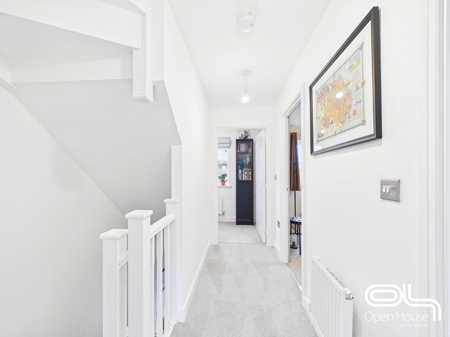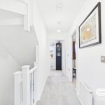 This first floor landing provides access to two bedrooms and a bathroom. It is efficiently laid out with neutral decor, creating a calm and restful atmosphere as you move between rooms.