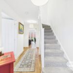 This bright and welcoming hallway features wood flooring that runs throughout the ground floor, leading to the staircase and connecting the entrance to the kitchen and living room. Its simple decor and natural light create an inviting first impression of the home.
