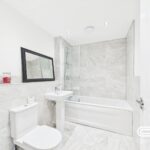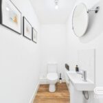 The ground floor cloakroom is a practical addition, fitted with a toilet and a small wash basin. Its clean, minimalist design maintains the fresh feel of the home’s interiors.