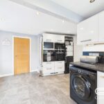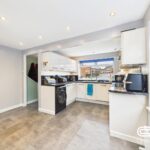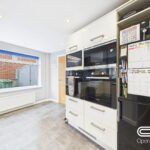 The ground floor is centred around an impressive open-plan living and dining room, flooded with natural light and finished with wood flooring and recessed lighting. This is a space that immediately feels generous, with clear zones for relaxing, dining, and hosting. Double doors open directly onto the rear garden, creating an easy flow between inside and out. A contemporary fitted kitchen sits to the front of the property, well laid out with ample storage, integrated appliances, and a pleasant outlook.