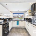 The kitchen is a modern and practical space featuring white cabinetry with integrated appliances, including a washing machine and dual ovens. The layout provides plenty of storage and workspace with black granite-effect countertops and a tiled splashback in monochrome tones. A large window above the sink allows for natural light and views to the outside. The kitchen seamlessly connects to the dining area and has a practical tiled floor for ease of maintenance.
