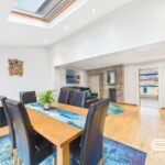 This dining area enjoys a bright atmosphere thanks to a large skylight and sliding doors that open to the garden patio. The space comfortably accommodates a wooden dining table with leather chairs and features wood flooring that extends from the living area. The open layout connects this space with the kitchen and living room, enhancing the sense of flow and light throughout the home.