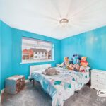 The second bedroom is a comfortable, well-lit space with a vibrant blue accent wall and a window that provides a lot of light. The room is fitted with carpet and radiators, making it suitable for various uses, including as a guest or children's bedroom.