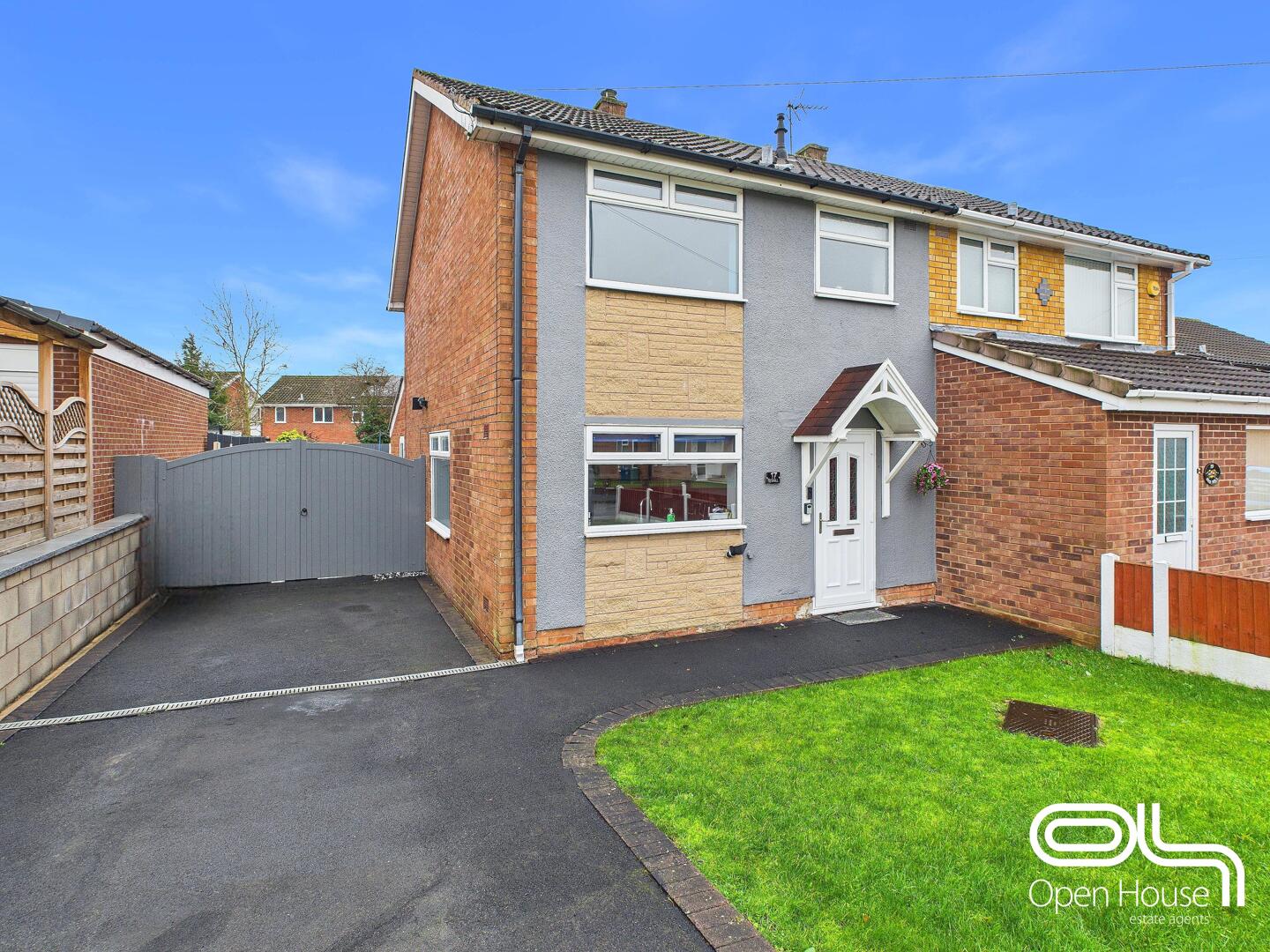 The exterior of the property presents a traditional semi-detached style with a mixture of brick and render finishes. It features a neat front garden area with lawn and a driveway leading to a gated side entrance, providing ample parking space. The overall appearance is tidy and welcoming, reflecting well-maintained surroundings.