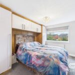 The main bedroom is a cosy and bright room featuring a large window overlooking the back garden. It includes fitted wardrobes with a wood-effect finish surrounding the bed area, offering practical storage. The neutral décor and plush carpet create a restful retreat.