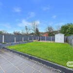 The rear garden offers a pleasant outdoor space with both a paved patio area and a generous lawn. It is fully enclosed with fencing, providing privacy and security. This garden is ideal for relaxing, outdoor dining, or children's play, with a garden shed for additional storage.
