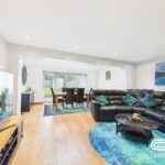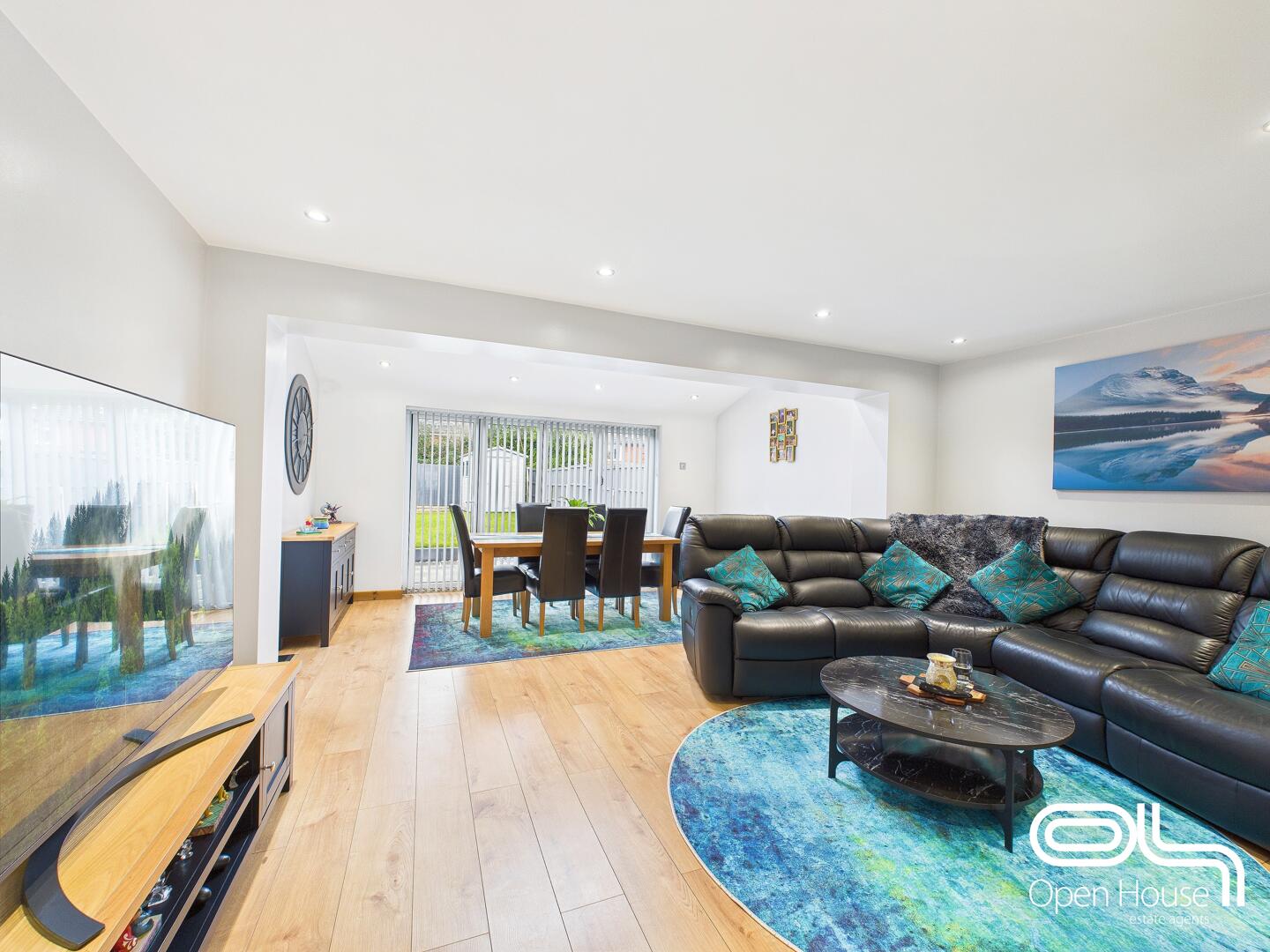 This inviting living room offers a generous space filled with natural light. It features a comfortable seating area with leather sofas and a large TV positioned for relaxed viewing. The room flows seamlessly into the dining area, where a wooden table is paired with leather chairs beneath a skylight, creating a bright and airy atmosphere. Recessed lighting and neutral walls complement the wooden flooring, enhancing the room's warm and welcoming feel.
