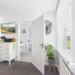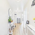 The **entrance hall** offers a bright and welcoming first impression, featuring a contemporary design with neutral tones and stylish décor. The space is well-lit, with pendant lighting adding warmth and ambiance. A modern console table with decorative accents and a large circular mirror enhances the sense of space. The wooden flooring complements the light-coloured walls, creating a seamless flow into the rest of the home. Practical yet elegant, this entrance sets the tone for the stylish interiors beyond.