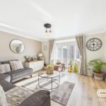 A beautifully presented lounge with a modern, neutral décor, creating a warm and inviting atmosphere. This spacious living area benefits from stylish wood-effect flooring, a feature pendant light, and a large bay window with patio doors that allow plenty of natural light to flow in while offering seamless access to the garden. The contemporary design is complemented by a mounted media wall, a sleek radiator, and ample space for a large sofa arrangement, making it an ideal space for relaxation and entertaining.