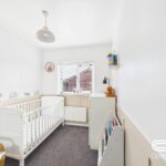 Bedroom three is a versatile space, perfect as a guest bedroom, home office, or dressing room. Featuring stylish panelled walls, neutral décor, and a large window that fills the room with natural light, it offers a bright and tranquil atmosphere. The plush carpeting adds warmth, making it a comfortable and inviting space.
