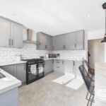A stunning, modern kitchen that has been thoughtfully designed to combine style and functionality. Featuring sleek grey cabinetry, elegant white countertops, and contemporary subway tiling, this space exudes sophistication. The large range cooker with an extractor hood is perfect for cooking enthusiasts, while ample storage and workspace ensure practicality. A breakfast bar offers casual dining options, and the bright window allows for plenty of natural light. Finished with high-quality tiled flooring, this kitchen is truly the heart of the home.