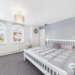 The master bedroom is an impressive and spacious retreat, featuring elegant arched windows that flood the space with natural light. The room is beautifully presented in a neutral palette, complementing the plush carpeting and contemporary decor. Access to dressing room with fitted wardrobes. The room benefits from a modern en-suite bathroom, making it a private and luxurious sanctuary within the home.