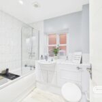 The family bathroom is stylish and well-appointed, featuring a modern three-piece suite comprising a bathtub with an overhead rainfall shower, a sleek vanity unit with integrated storage, and a low-level WC. The space is finished with elegant tiling, a heated towel rail, and a frosted window for privacy while allowing natural light to filter in.