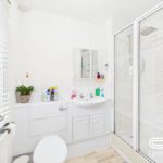 The en-suite bathroom is a well-appointed space, designed for convenience and comfort. It features a large glass-enclosed shower with a modern overhead fixture, complemented by a stylish white vanity unit with built-in storage. The contemporary white suite includes a toilet and a sleek basin with a mirrored cabinet above, offering additional storage. Finished with light flooring and neutral decor, this en-suite provides a bright and refreshing atmosphere.
