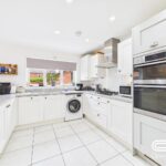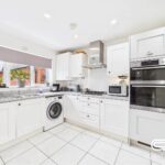Designed for modern living, this beautifully presented open-plan kitchen and dining space is the heart of the home. The stylish kitchen is fitted with sleek white cabinetry, high-end integrated appliances, and ample countertop space, making meal preparation a delight. A large window allows natural light to flood in, offering views of the rear garden, while recessed lighting creates a warm ambiance.